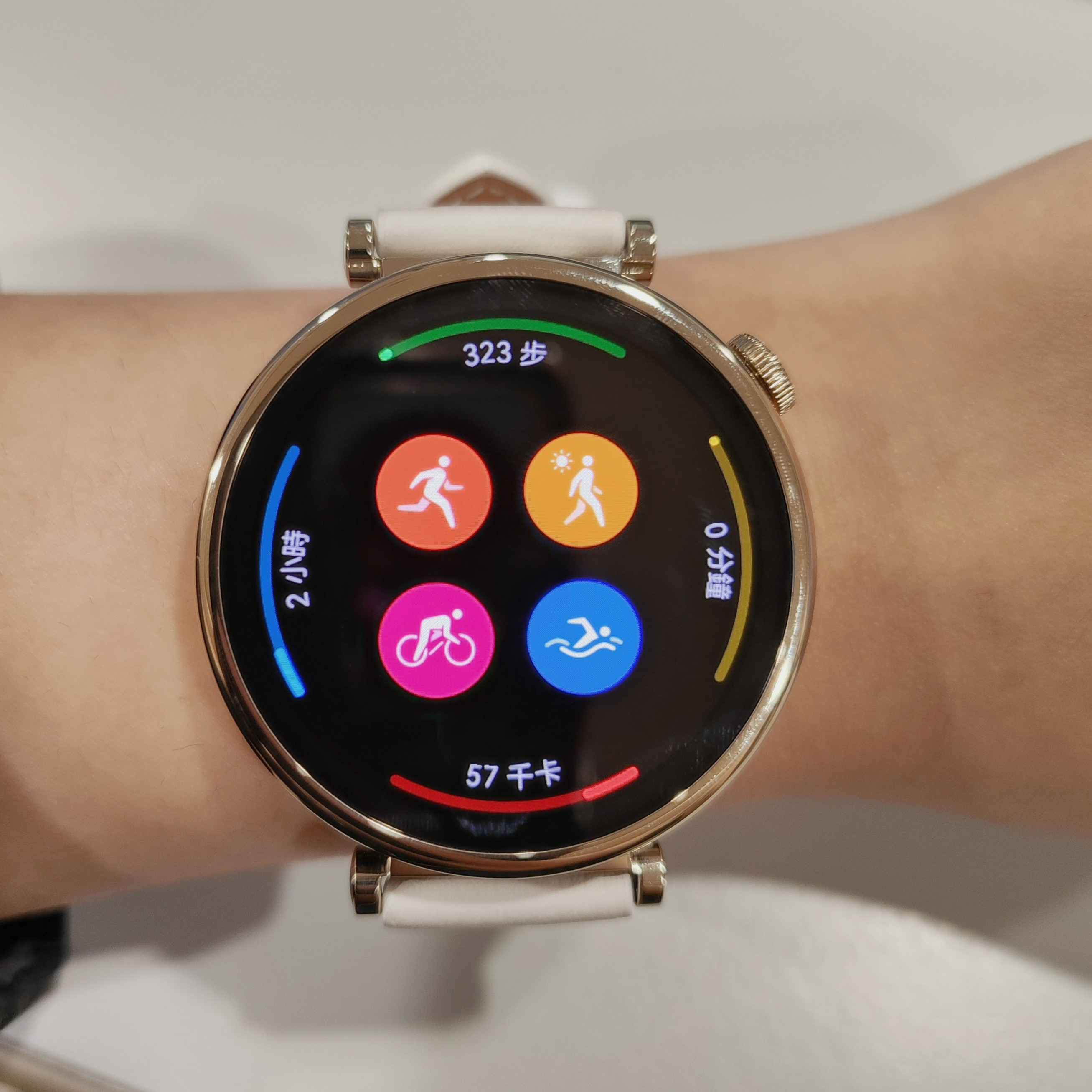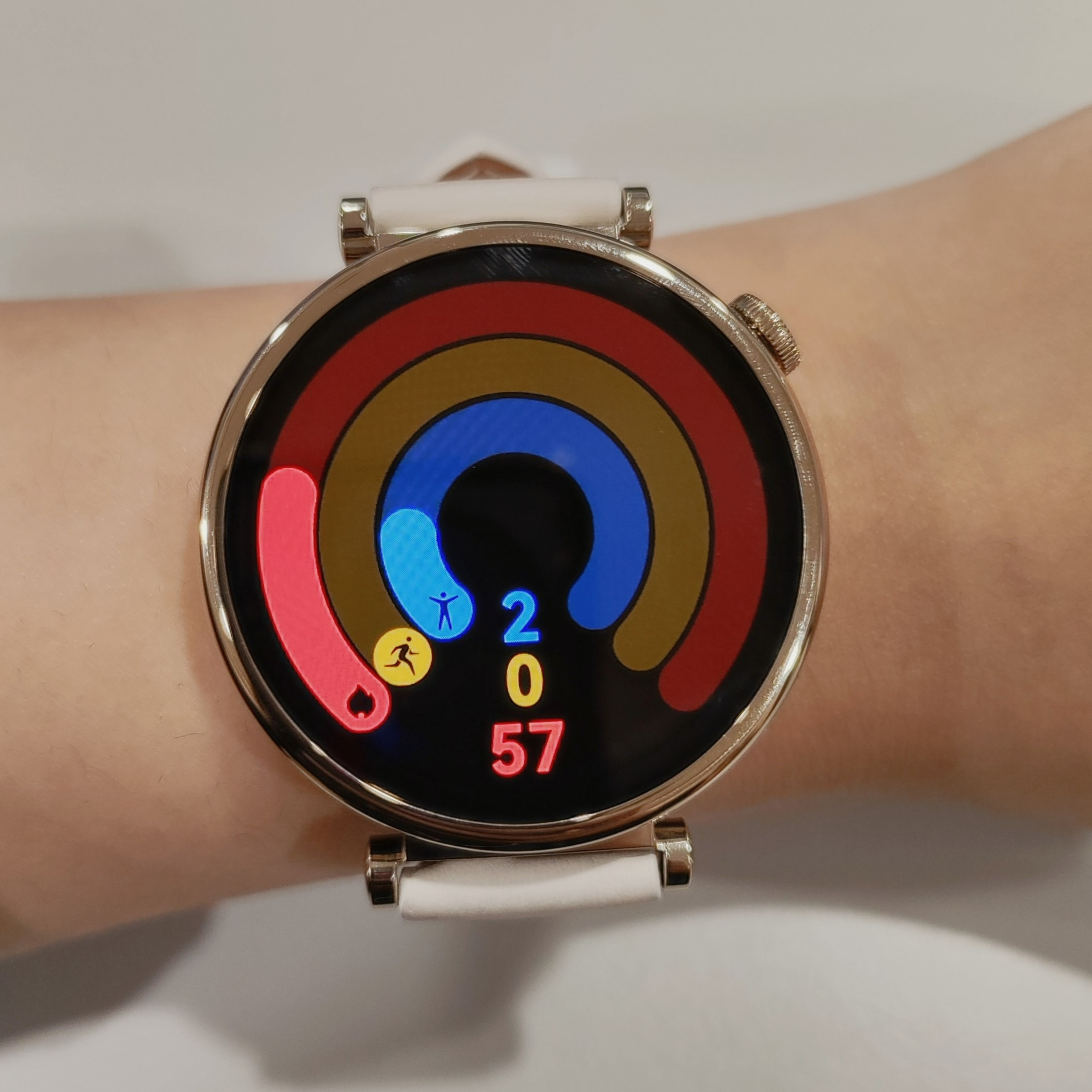 GT4智能手錶的三環活動紀錄功能非常實用而不失簡約。在錶面上,紅、黃、藍分別代表熱量、鍛鍊時間、活動時間。紅色顯示運動消耗的熱量,黃色是走路或運動時間,而藍色則跟蹤著你的基礎起身等活動。這直觀的分類不僅清楚呈現你的日常活動,也讓你可以快速了解自己的運動狀態。
