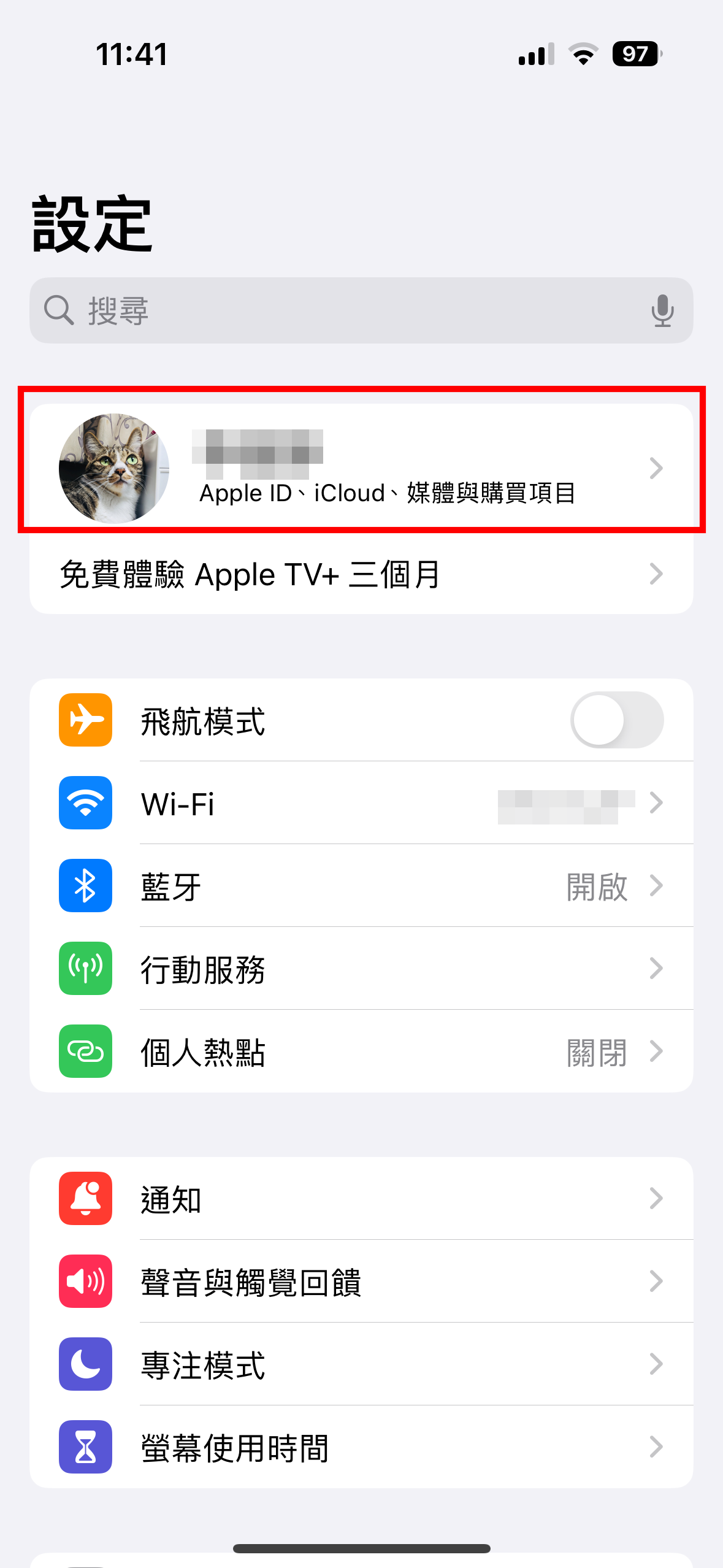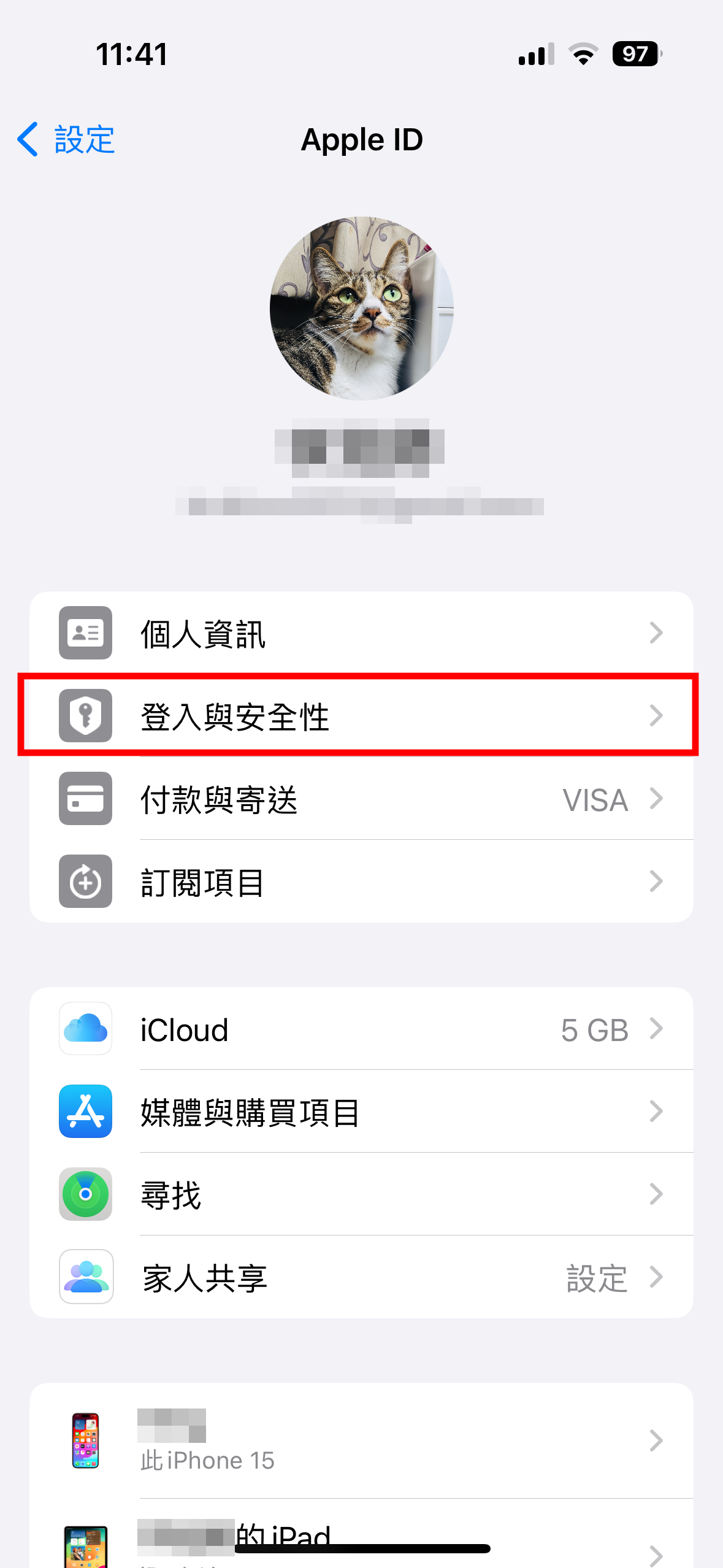 打開iPhone「設定」,點選「Apple ID大頭貼」>「登入與安全性」。