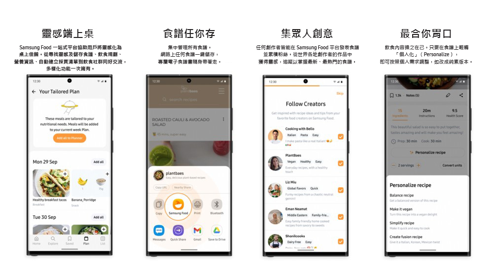 使用者在搜尋食譜的時候,可以把食譜儲存到Samsung Food的個人數位食譜檔夾。Samsung Food就跟料理小幫手一樣,使用AI技術會根據你的飲食習慣調整已經儲存的食譜,例如把食譜換成麻辣風味的或是全素版本,創造更符合使用者的客製化食譜。