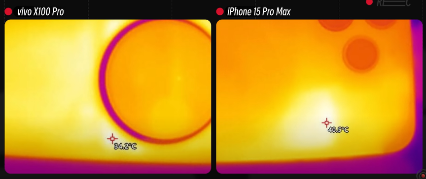 遊玩英雄聯盟半小時後 vivo 與 iPhone15 Pro Max 的最高溫度對比
