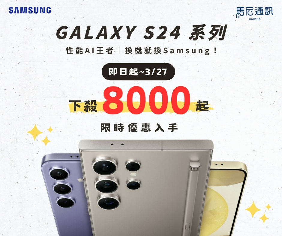 現在限時活動,S24 系列下殺 8000 元起,讓您以最優惠的價格體驗全新一代旗艦機的最新技術。快來馬尼門市!搭配門號優惠更多喔!