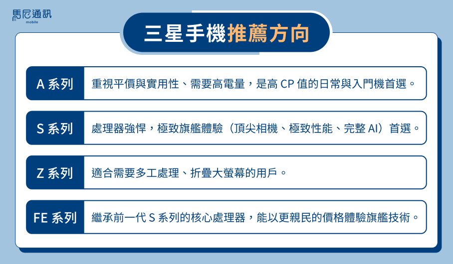 | A 系列 | 中階處理器,滿足日常 App 與一般遊戲需求。 | 優質主鏡頭,能滿足日常攝影需求。 | 電池容量大方,通常比 S 系列更大,續航力充足。 | 平價入門、高 CP 值。適合學生、孝親或備用機。 |