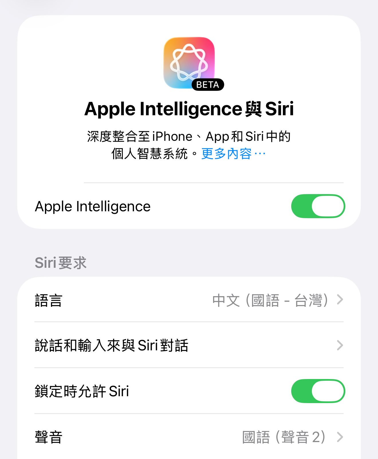 啟用 Apple Intelligence:前往「設定」>「Apple Intelligence & Siri」,開啟「Apple Intelligence」開關,並選擇「繁體中文」作為預設語言。