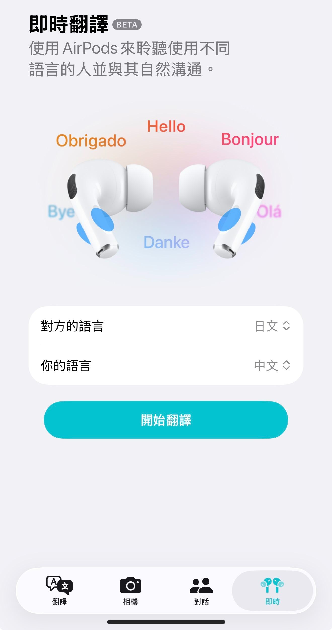 透過長按左右耳機開啟後,便能即時翻譯不同語言,在雙方都有耳機的時候就能即時轉譯,如對方沒有配戴AirPods也可以對手機語音輸入並外放給對方聆聽。