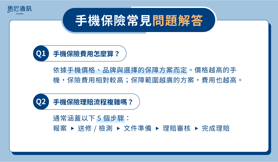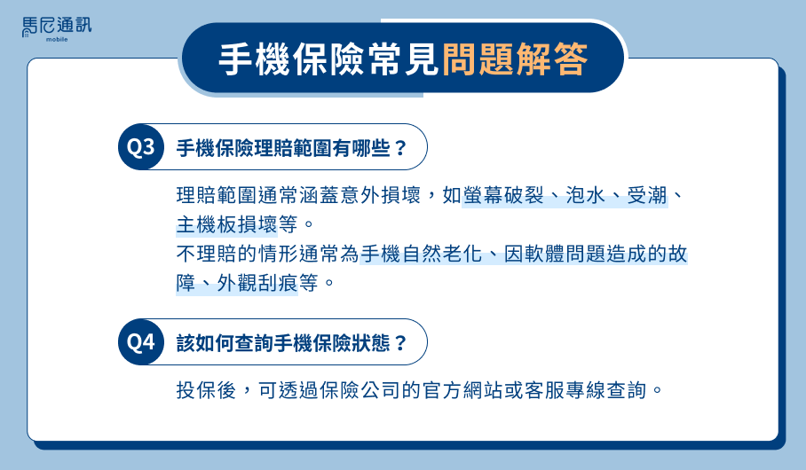 | 馬尼通訊 | 意外損壞(螢幕破裂、泡水、主機板)、竊盜、電池老化 | 依空機價格而定,提供不同價格區間的方案 | 1 年、2 年 |