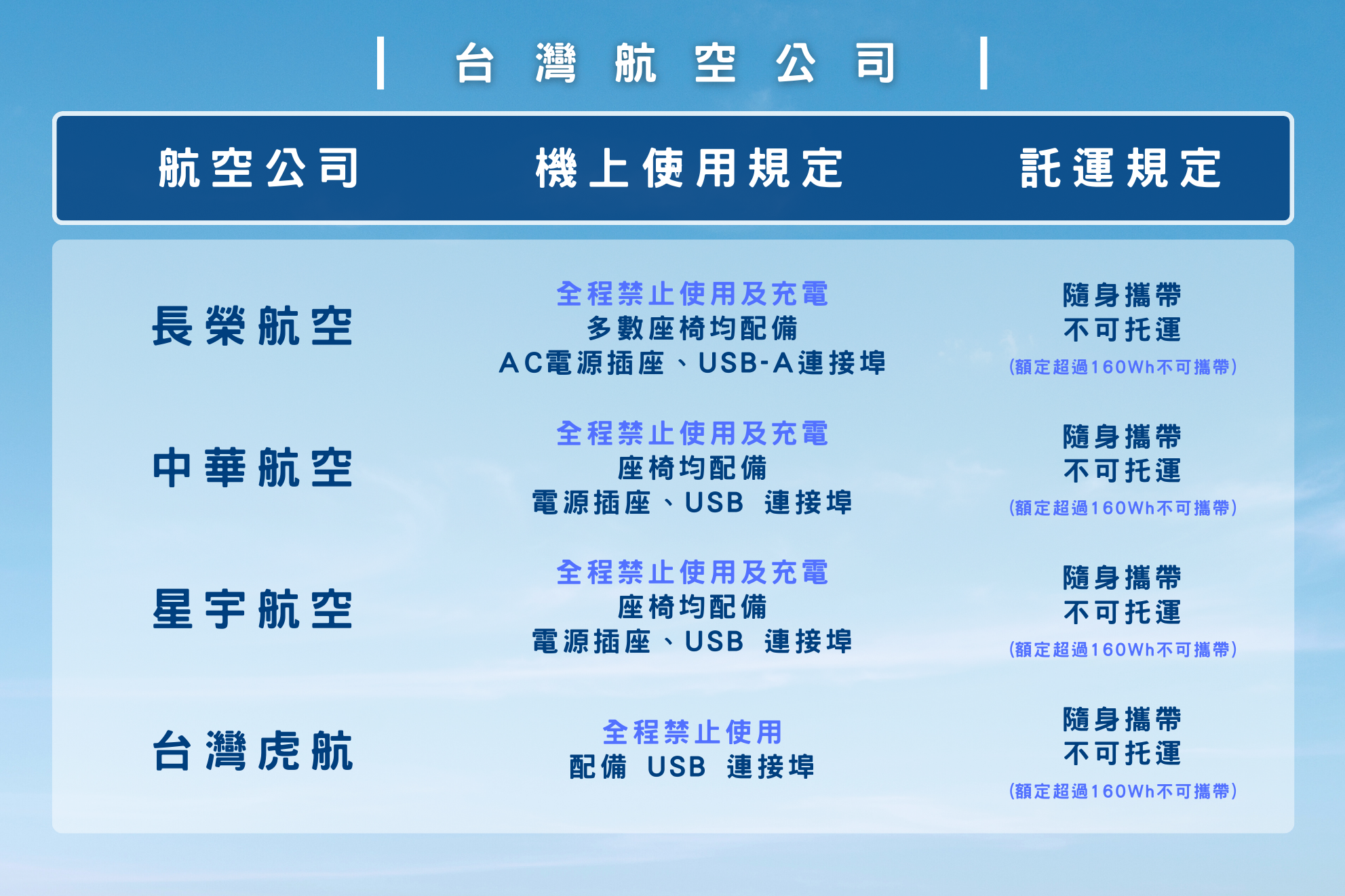 2. 長榮航空:2025年3/1 起,全面禁止於航程中使用及充電行動電池與備用鋰電池