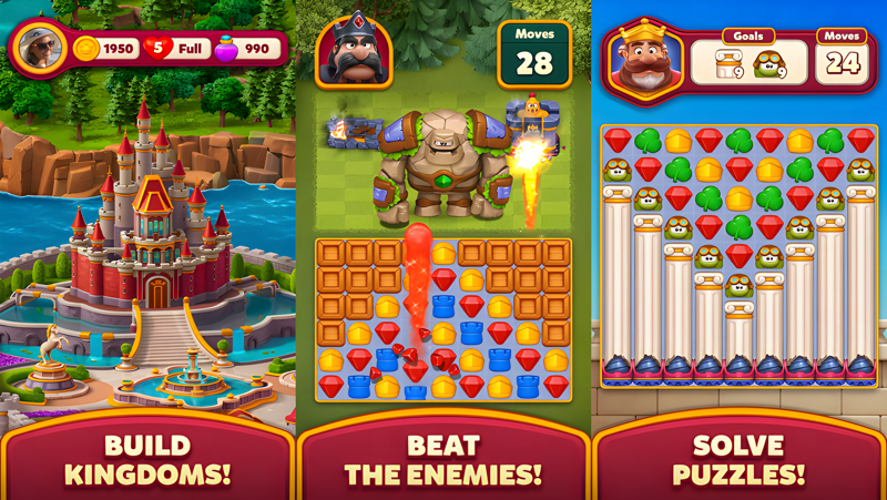 - 特色:三消消除結合王國裝飾,玩家通過關卡獲得金幣與裝飾道具,逐步打造城堡、花園與海洋宮殿,關卡設計隨機性高,支援每日挑戰與團隊活動。