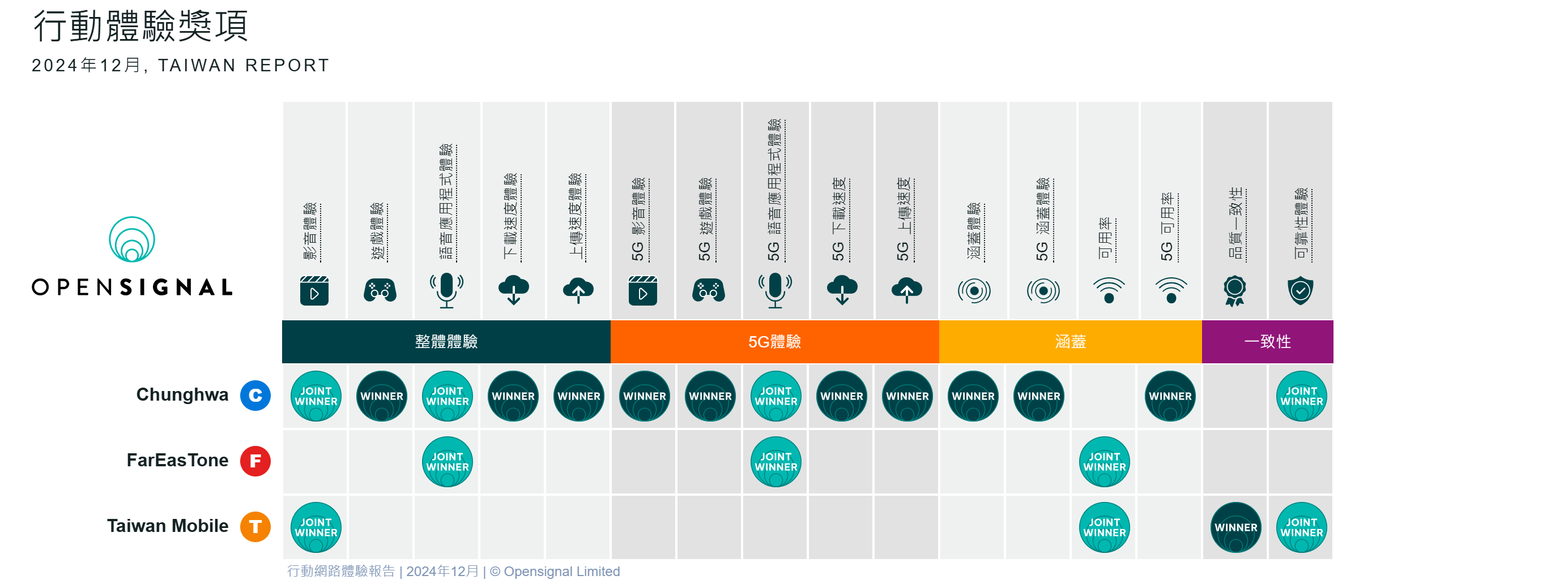 2024年12月台灣行動網路速度報告近日由國際知名分析機構Opensignal公佈,報告中揭示了台灣三大電信業者在行動網路表現上的亮眼成果。其中,中華電信以卓越的表現奪得14項獎項,成為本次報告的最大贏家。