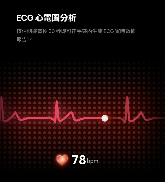 GT6 Pro 支援 ECG 功能,可檢測房顫負荷等心臟健康指標,適合有心血管擔憂的使用者。