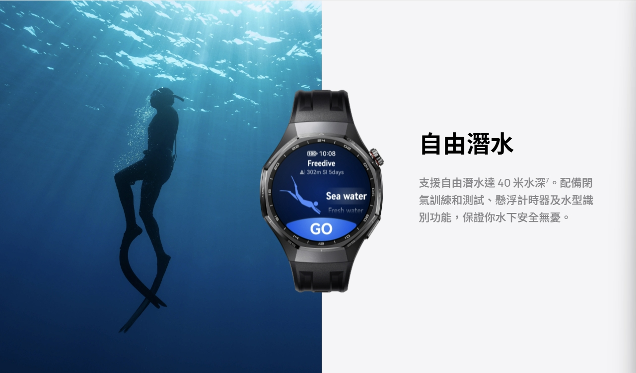 支援 100+ 種運動類型,包括騎行功率測量和高爾夫模式。GT6 Pro 更適合戶外活動,如自由潛水達 40 米深度,結合深度感測器提供專業數據。