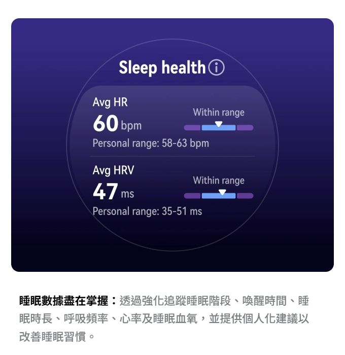 透過先進感測器,分析深度睡眠、淺眠和 REM 階段,並提供壓力緩解建議。情緒識別功能能偵測用戶心情變化,提醒適時休息。