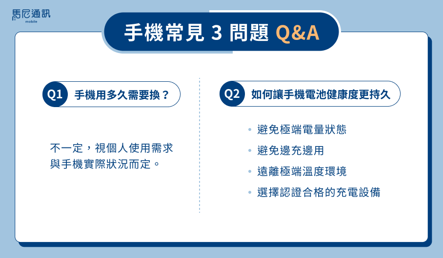 在使用手機的過程中,您是否曾對手機的更換時機、電池保養方法,以及琳瑯滿目的配件挑選感到困惑?以下將統整並解答幾個常見的手機使用問題,幫助您更聰明地延續手機壽命、提升整體使用體驗。