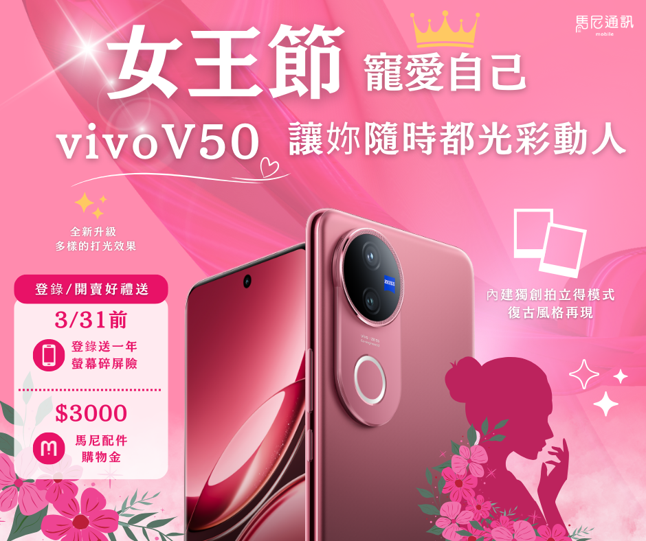 優惠有限,手腳要快!趕快來馬尼行動通訊把vivo V50帶回家吧!記住,女王的生活,就是要這麼有質感、有態度、有柔光環~